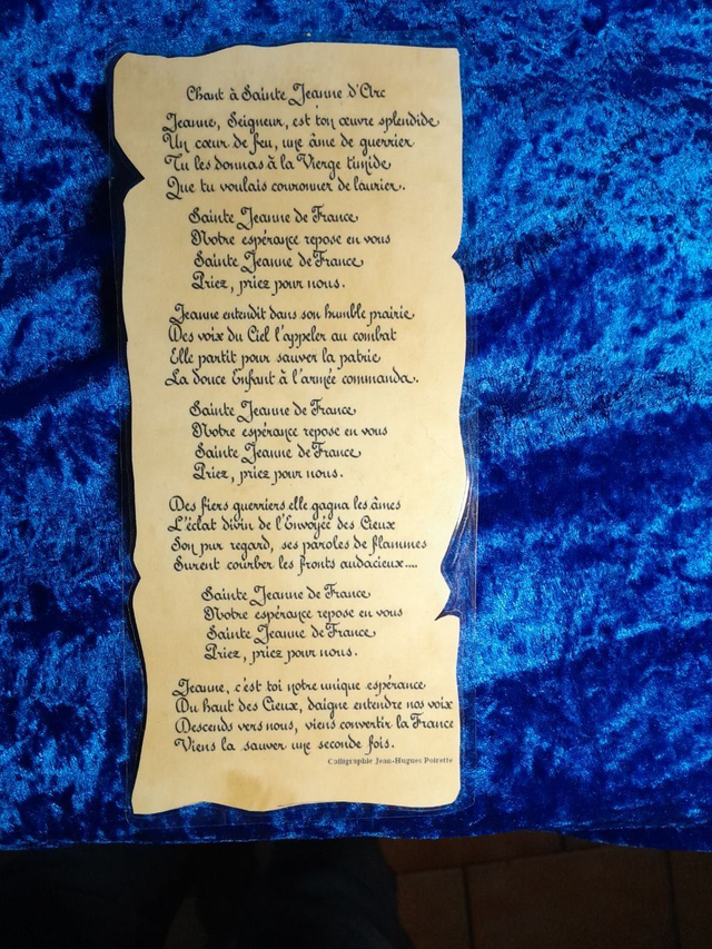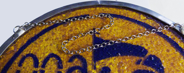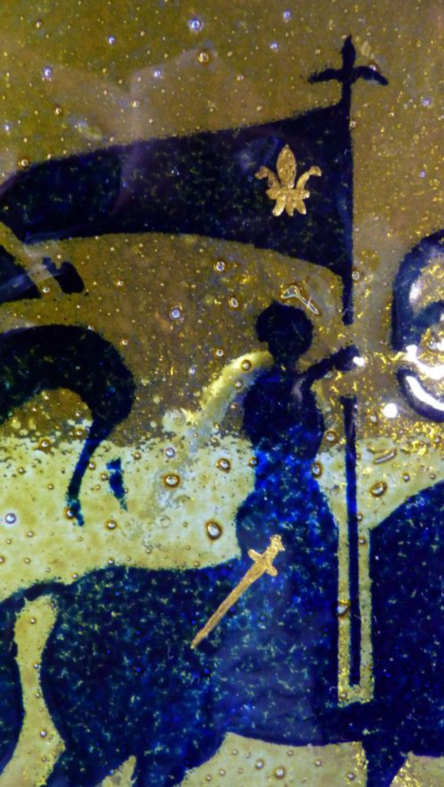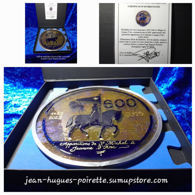 Médaillon "Calliverre" fusionné à 850°C/24h de couleur ambre, bleu cobalt et or. Représentant Sainte Jeanne d'Arc se tenant sur son cheval l'étendard orné d'une fleur de lys peinte en or, tout comme son épée à la taille et les sabots de sa divine monture. Médaillon "Calliverre" serti au plomb avec chainette de suspension (argent vieilli) de 3 x 4 mm et d'une longueur de 25 cm. Peut être suspendu ou posé sur un petit chevalet (non fourni). Création exclusive limitée à seulement 30 exemplaires numérotés et signés par l'artiste Jean-Hugues Poirette.